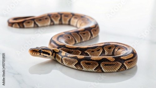 Obraz premium Close-up of a healthy ball python, its striking patterns and smooth scales highlighted against a stark white backdrop, ideal for pet care or educational content.