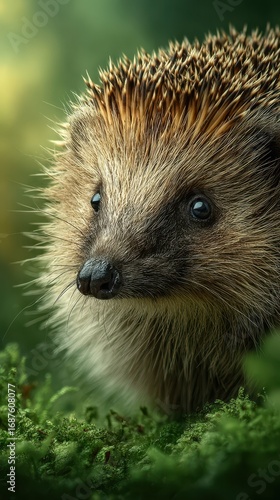 © Michael, Fototapeta premium Close-up of a hedgehog in a vibrant green forest environment enjoying a sunny day