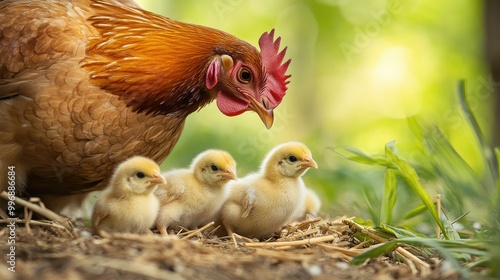 © arthit, Fototapeta premium Close-up of a hen feeding her chicks, with straw and grass in the background offering space for text.