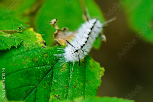 Naklejka premium Close-up of a Hickory Tussock Moth on a leaf, with its neat white and black furry pattern