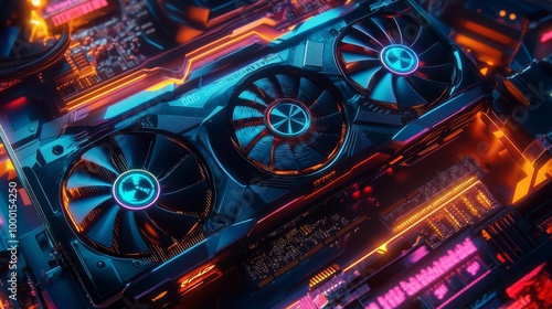 Fototapeta premium Close-up of a high-performance gaming graphics card with vibrant LED lights,...