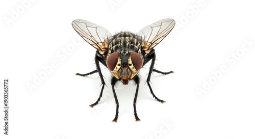 © Khasani, Obraz premium Close-up of a housefly with wings spread on white background.