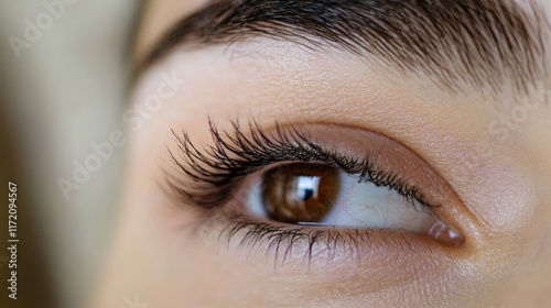 Obraz premium Close-up of a human eye, showcasing eyelashes and iris details.