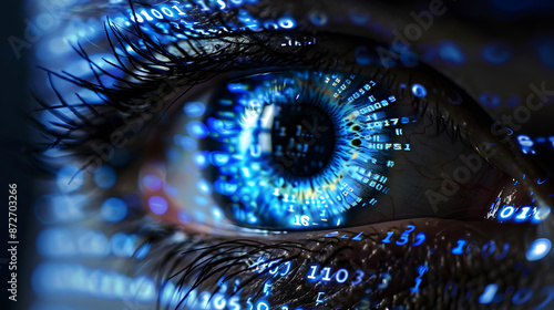 Naklejka premium Close-up of a human eye with digital and cybersecurity elements, representing technology, data protection, and cyber intelligence.