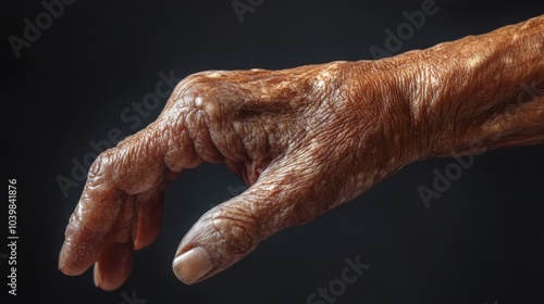 Fototapeta premium 2410 21.Close-up of a human hand showing symptoms of discoid eczema, with swollen, cracked, and itchy circular patches on the skin. The rough texture and inflamed spots are clearly visible,