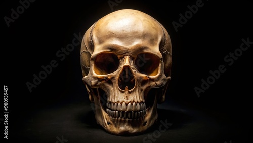 © Caitlin, Fototapeta premium Close-up of a human skull isolated on a black background, viewed from the front
