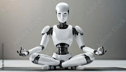 © Alberto Masnovo, Fototapeta premium Close-up of a humanoid robot in yoga meditation with crossed legs, front view. Artificial intelligence concept. Generative Ai.