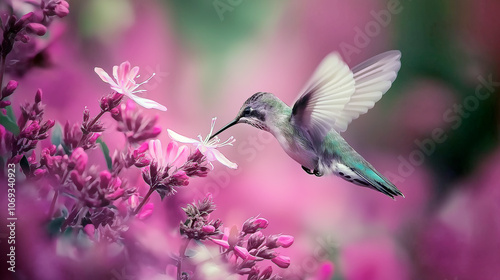 © creativenergy.it, Naklejka premium Close-up of a hummingbird drinking nectar from bright pink blooms