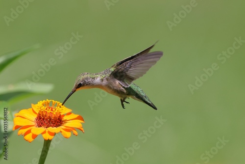 © Wirestock, Fototapeta premium Close-up of a hummingbird feeding on a vibrant flower with green blurry background