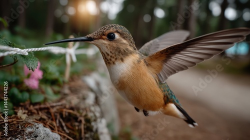 © Oksana, Fototapeta premium Close-up of a Hummingbird Hovering Near a Flower with a Forest Background During Sunset