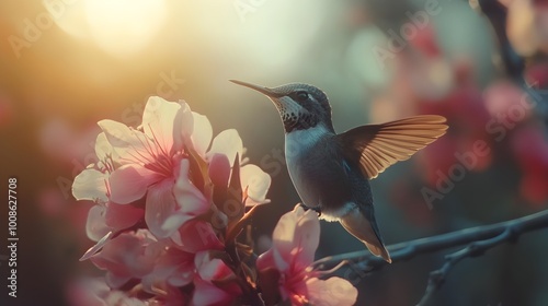 Fototapeta premium Close-up of a hummingbird pollinating a flower, vivid color texture and detail, in nature, soft natural lighting