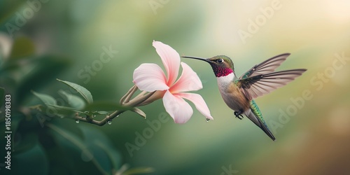 Naklejka premium Close-up of a hummingbird with iridescent feathers, capturing focus on small bird behavior, environmental conservation focus