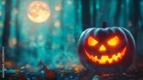 Fototapeta premium Close-up of a jack-o'-lantern with a menacing face, illuminated from within, against a blurred Halloween background of the forest and an autumn-colored full moon.