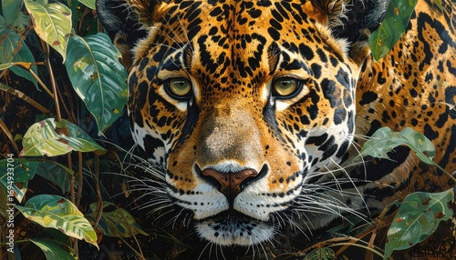 Fototapeta premium Close-up of a jaguar head, showcasing intricate patterns and lush jungle foliage. The jaguar's piercing gaze draws the viewer in, amidst vibrant greens and browns.