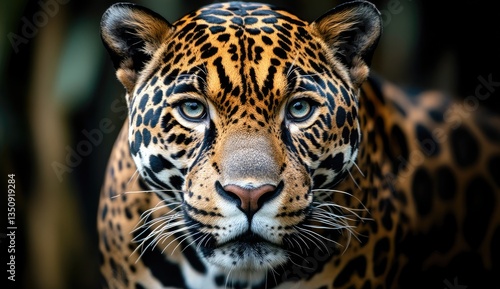 Naklejka premium Close-up of a jaguar's face. Intense gaze, spotted coat