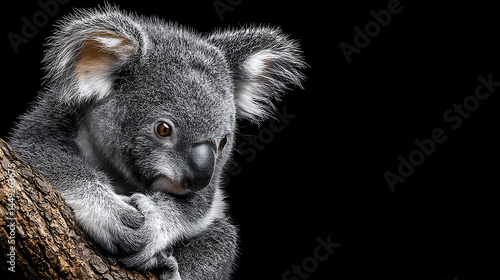 © Anita, Fototapeta premium Close-up of a koala perched on a branch against a dark background, showcasing its features