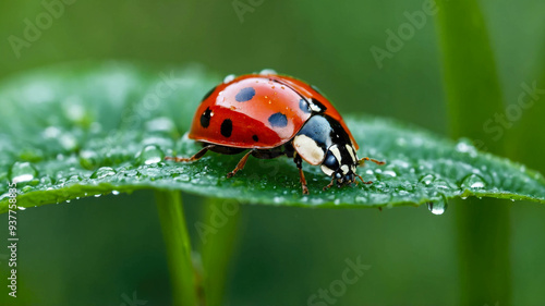 Obraz premium Close-up of a ladybug on a dewy leaf in a lush green background