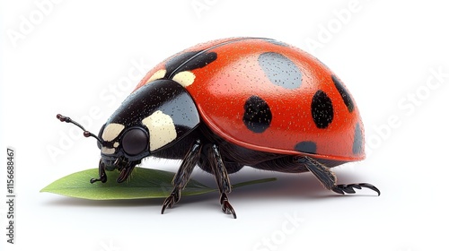 © Jasan, Fototapeta premium Close-up of a ladybug on a green leaf, isolated on white background.