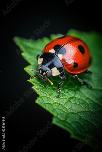 © Byca, Fototapeta premium Close-up of a ladybug on a leaf with a dark background