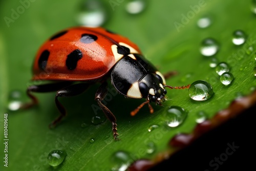 Fototapeta premium close-up of a ladybug on a leaf with water droplets