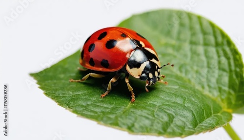 © diditlagi, Fototapeta premium Close-up of a ladybug on a vibrant green leaf.