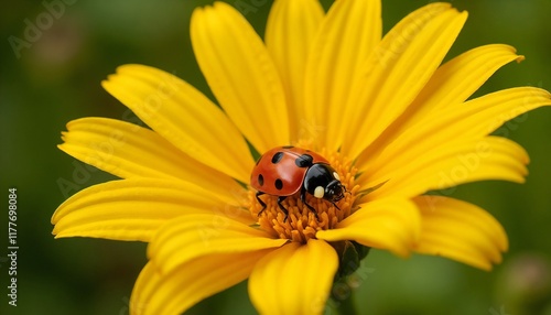 Fototapeta premium Close-up of a ladybug on a vibrant yellow flower with soft green background