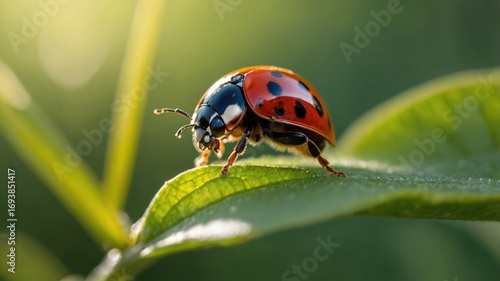 Fototapeta premium Close-up of a ladybug perched on a green leaf, surrounded by a soft, blurred...