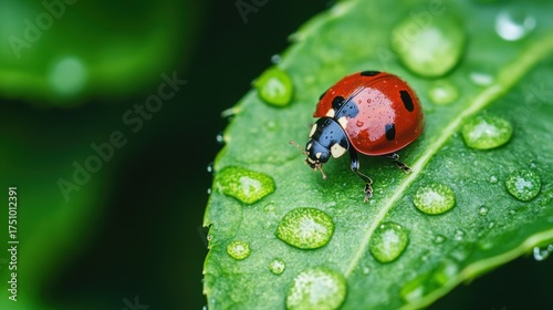 Obraz premium Close-up of a ladybug resting on a green leaf after a rain