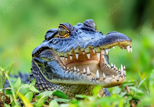Fototapeta premium Close-up of a Large Crocodile with Sharp Teeth and an Intimidating Expression Surrounded by Lush Greenery in Its Natural Habitat