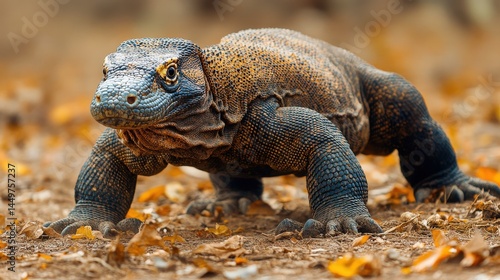 Obraz premium Close-up of a large Komodo dragon in a natural habitat.