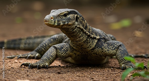 Fototapeta premium Close up of a Large Monitor Lizard Resting on Textured Ground