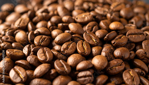 Naklejka premium Close-up of a large pile of freshly roasted coffee beans, highlighting their...