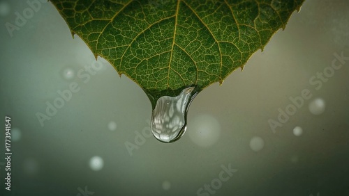 Fototapeta premium Close-up of a leaf with a water droplet hanging from the tip, showcasing...