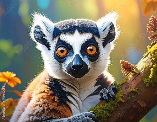 © Ongkos, Naklejka premium Close-up of a lemur in a vibrant forest setting