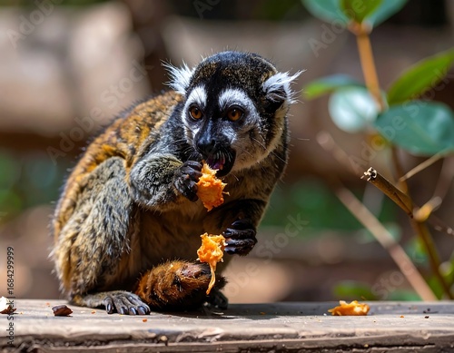 Obraz premium Close-up of a lemur with a piece of fruit in its paws, captured in sharp...