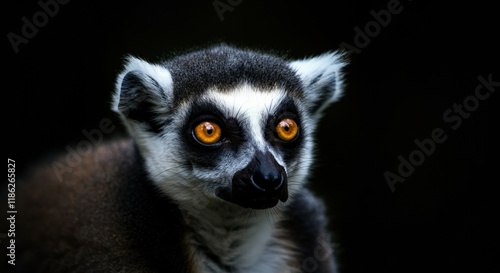 © Alexandr, Fototapeta premium Close-up of a lemur with striking orange eyes against a dark background