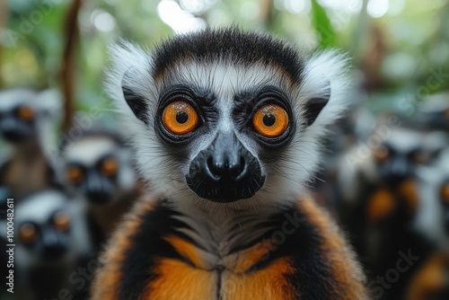 Obraz premium Close-up of a lemur with striking orange eyes surrounded by other lemurs in a...