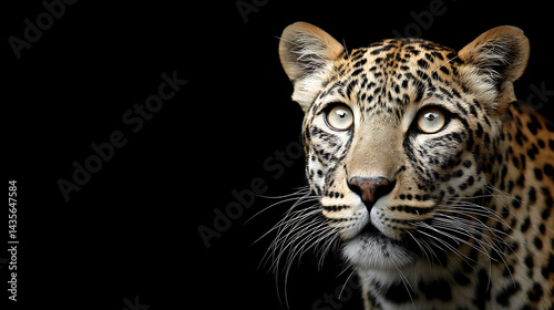 © Anita, Naklejka premium Close-up of a leopard gazing with piercing eyes against a dark background, showcasing its beauty