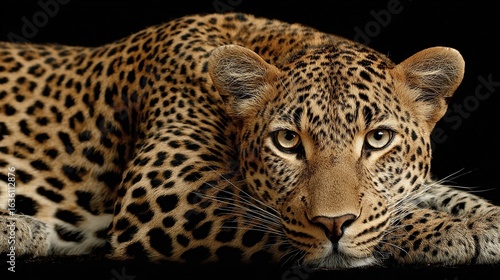 Obraz premium Close-up of a leopard resting, its eyes gazing intensely forward on a dark...