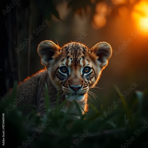 © bikash, Fototapeta premium Close-up of a Lion cub looking at the camera lion cub. Lion cub poking cute lion cub poking looking at the camera Portrait of Lion Cub Gazing in Camera Isolated on Black Background.