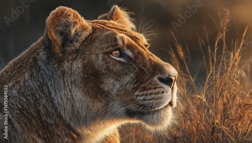 © farisky, Naklejka premium Close-up of a lioness, profile view, golden light