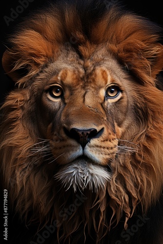 © JONATAS, Fototapeta premium Close Up of a lions face on a black background, generative IA