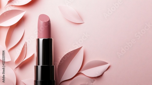 Obraz premium Close-up of a lipstick with a soft pink color, its glossy tube placed on a...