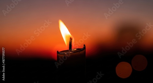Fototapeta premium Close-up of a lit candle against a vibrant orange and red sunset backdrop,...