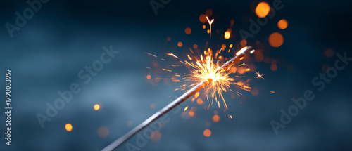 Fototapeta premium Close-up of a lit sparkler emitting bright sparks with bokeh effect on a dark blue blurred background