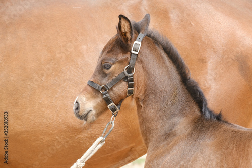 Obraz premium Close-up of a little brown foal,horse standing next to the mother, during the day with a countryside landscape
