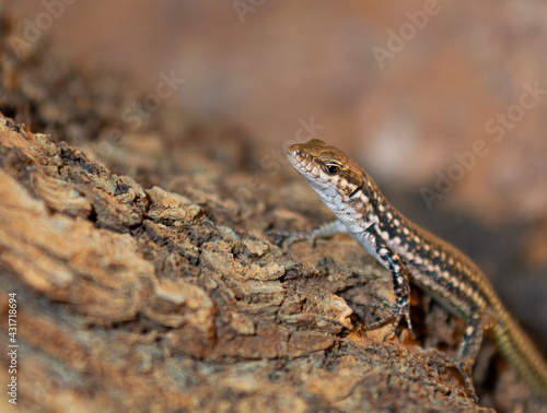 © Miguel Photography, Naklejka premium Close-up of a lizard (Podarcis hispanicus) on a log, Spain.