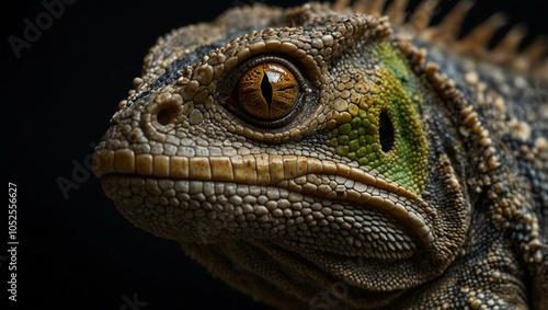© claudunia, Fototapeta premium Close-up of a lizard's head on a black background.