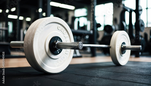 © JuliaM, Naklejka premium Close-up of a loaded white barbell in a fitness center