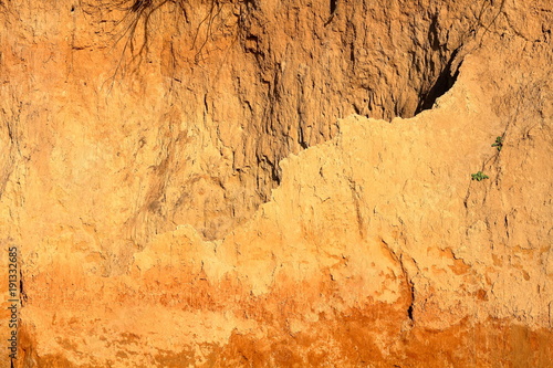 © watcherfox, Fototapeta premium Close-up of a loamy ravine wall as an environmental texture background. Seaside coastal erosion with clay soil